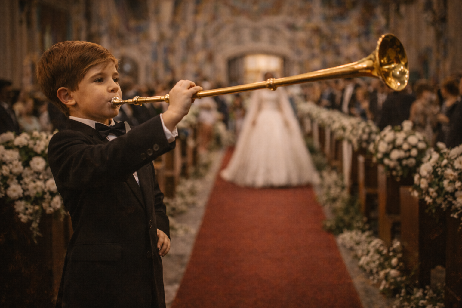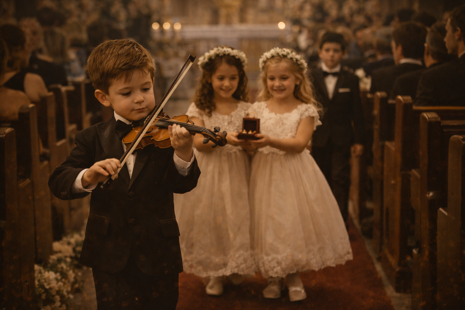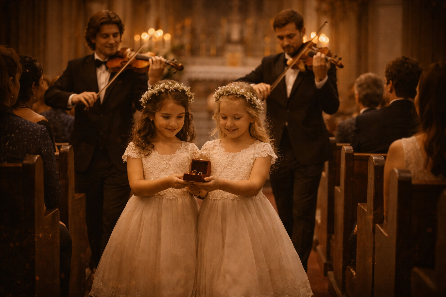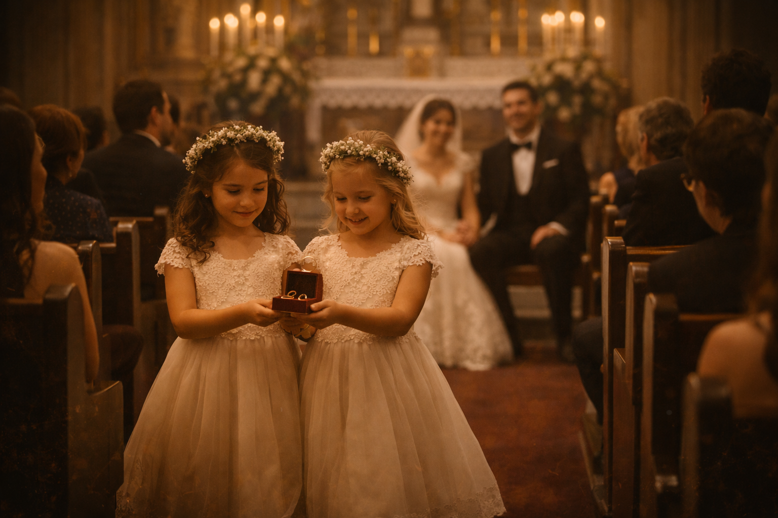 Criação do Maestro: Damas de Honra levam as Alianças até aos Noivos, no meio do Cerimonial, criando assim um momento de descontração durante a Celebração.