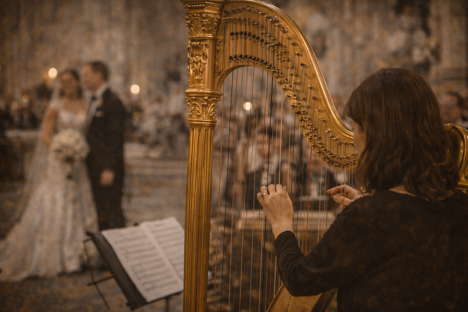 Único Coral a ter uma HARPA DOURADA exclusiva para tocar a musica “Ave Maria”, no Altar, ao lado dos Noivos. A Harpista Lúcia Tanus (filha do Maestro) é quem nos encanta com este instrumento angelical.